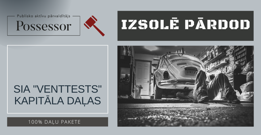 Elektroniskā izsolē ar augšupejošu soli par izsoles sākumcenu 699 tūkst. eiro apmērā interesentiem tiek piedāvāta SIA “VENTTESTS” 284 802 kapitāla daļu pakete jeb 100% no pamatkapitāla. Autorizācijas pieteikums dalībai elektronisko izsoļu vietnē ir jāiesniedz no 28.septembra līdz 18.oktobrim. SIA “VENTTESTS” kapitāla daļu elektroniskā izsole noslēdzas 28.oktobrī. Izsoles solis – 10 tūkst. eiro. Plašāka informācija par SIA “VENTTESTS” kapitāla daļu elektronisko izsoli, t.sk. pārdošanas noteikumi, ir pieejama Possessor mājaslapā ŠEIT.